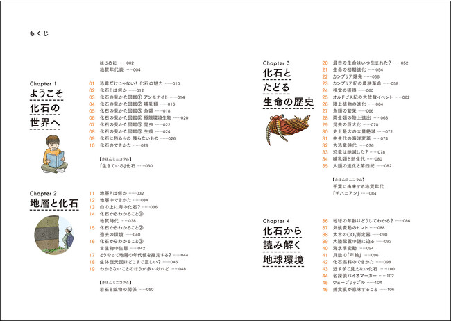 本書では、バラエティーに富んだ化石を通じて、生命の歴史や地球環境の変動について、イラストを使ってわかりやすく解説します。