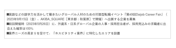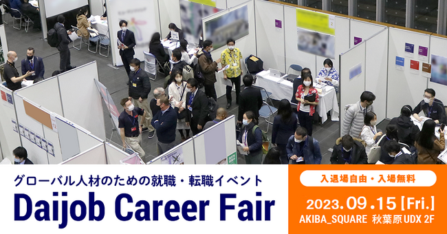 ビジネス・プロフェッショナル×バイリンガルのための転職・求人情報サイト「Daijob.com」を展開するヒューマングローバルタレント株式会社(本社:東京都新宿区、代表取締役:横川 友樹、以下「当社」)は、転職イベント「第49回Daijob Career Fair」を2023年9月15日(金)にAKIBA_SQUARE(東京都:秋葉原)で開催するにあたり、出展企業を募集します。