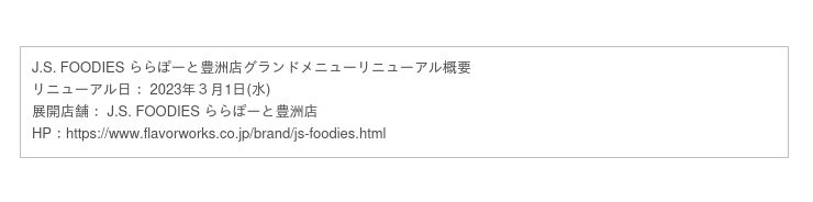 食のセレクトショップ「J.S. FOODIES」 ららぽーと豊洲店 3月1日(水)グランドリニューアル!