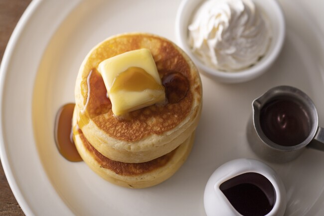 注文が入ってからじっくり焼きあげる、さっくり&しっとりとした食感が特徴のビスケットホットケーキ。別添えのホイップクリームやメープルシロップ、チョコレートソースをお好みでかけて自分好みの一皿に。