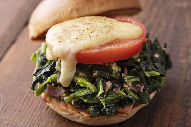 STUFF人気NO.1バーガー。たっぷりのほうれん草をソテーし、トマトとチーズを合わせた新感覚バーガー。