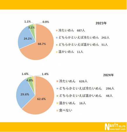 「冷たいめん」626人と「どちらかといえば冷たいめん」296人を合わせると922人。昨年の調査929人とほぼ同じくらいの割合です。