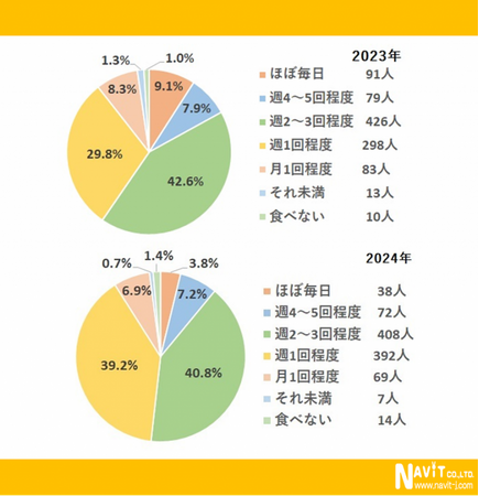 めんを夏に食べる頻度は「週2〜3回程度」が昨年に比べ若干減りましたが、408人でトップは不変。2番目は「週1回程度」で392人。昨年に比べ31%増え、トップとの差を詰めました。