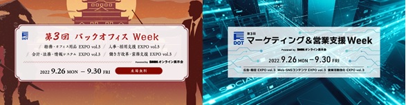 「みんなのお仕事文化祭 2022秋」は、「第3回バックオフィスWeek」および「第3回 マーケティング&営業支援 Week」の開催に先駆け、ビジネスセンスをアップデートするトークセッションをお届けするビジネスカンファレンスです。「みんなのお仕事文化祭 2022秋」参加後はぜひバックオフィス、マーケティング&営業支援のオンライン展示会へご参加ください。