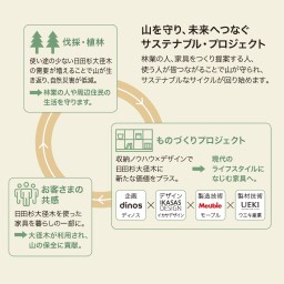 森を守るサイクルには消費者の参加があってはじめて成立します。日常に取り入れてもらうことで結果として、日田杉の大径木が利用され森林保全でき、しいては林業や地域住人を守ることに繋げています。林業の人、家具をつくり提案する人、家具を使う人がつながることで山が守られ、サスティナブルなサイクルを形成しています。