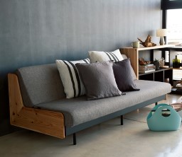 ソファのサイドパネルに日田杉の無垢材を使用したごろ寝ソファベッド。ベッドとしてもソファとしても使用できる機能性とともにナチュラルで優しい質感が発売以来好評を得ています。