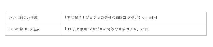 パズドラ公式Twitterアカウント(@pad_sexy)をフォローして、公式アカウントから投稿される対象のツイートを「いいね」しましょう。対象ツイートの5万「いいね」達成で「開催記念!ジョジョの奇妙な冒険コラボガチャ」、10万「いいね」達成で「★6以上確定 ジョジョの奇妙な冒険ガチャ」をユーザーの皆様へプレゼントします。皆様からのたくさんの「いいね」をお待ちしております。