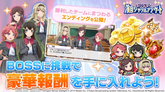 株式会社エイチーム(本社:愛知県名古屋市、代表取締役社長:林高生)は、株式会社ブシロード(本社:東京都中野区、代表取締役社長:橋本義賢、以下ブシロード)および、株式会社TBSテレビ(東京都港区赤坂、代表取締役社長:佐々木卓、以下TBS)と共同開発したスマートフォン向けゲームアプリ『少女☆歌劇 レヴュースタァライト -Re LIVE-』(スタリラ)にて、初のチーム対抗イベント「気になる?演目ジャンルアンケート」を開催します。