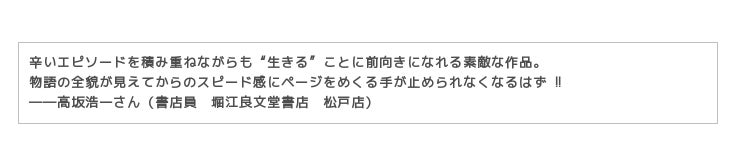現代を生きる少年少女の成長物語をしっかりと捕らえたこの推薦文は、本作のテーマとなる部分を深く、鋭くえぐっている。さらに書評家や書店員からも本作に寄せた絶賛のコメントが届いている。