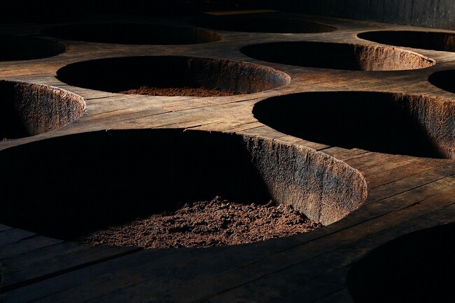 発酵環境は人工的な温度コントロールでなく、四季の温度変化による「天然醸造」。寒い時期に仕込み作業が行われ、夏にはぷくぷくと発酵がはじまります。春夏秋冬によって、木桶はその表情を変えながら醤油に適した環境をつくります。湿気が多ければ吸収し、寒い時には保温するように、いつも表情が異なります。