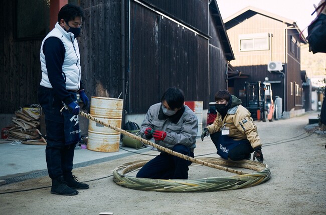 完成した芯は小豆島に持ち帰り、実際の木桶づくりに活用。芯は木桶の周りを囲む竹箍(たけたが)の内側に入れることで竹箍のふっくらした綺麗なシルエットを保つと共に、木桶との隙間を埋めて密着させるために欠かせない部材で、木桶の寿命である100〜150年の間、その役割を果たし続けます。