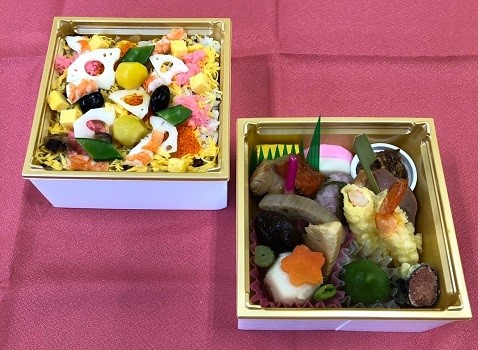 上段に鰈西京焼やだしの風味豊かな煮物などの料理を、下段に彩り華やかなちらし寿司と甘味の入った