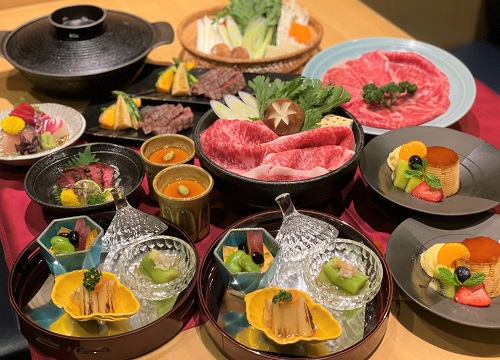 <前菜、蒸し物、刺身、ミニステーキ、名代牛鍋または、しゃぶしゃぶ(松・竹コースのみ)、