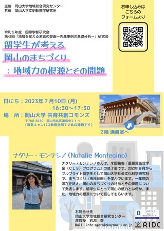 【岡山大学】第6回「地域を変える若者の参画-先進事例の基礎分析-」研究会「留学生が考える岡山のまちづくり:地域力の根源とその問題」〔7/10, 月 岡山大学津島キャンパス〕