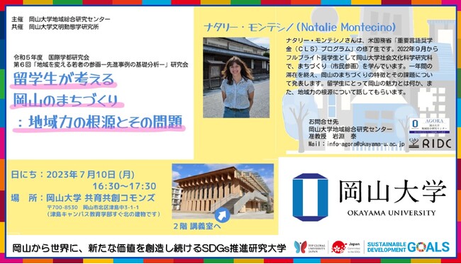 今回、2023年7月10日(月)16:30〜17:30に本学津島キャンパスにおいて、米国務省「重要言語奨学金(CLS)プログラム」修了生であり、現在フルブライト奨学生として岡山大学社会文化科学研究科で市民参画を学んでいるナタリー・モンテシノさんが語る、岡山のまちづくりの特徴や課題、留学生にとっての岡山の魅力などについて発表します。