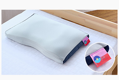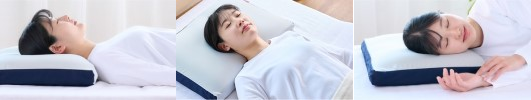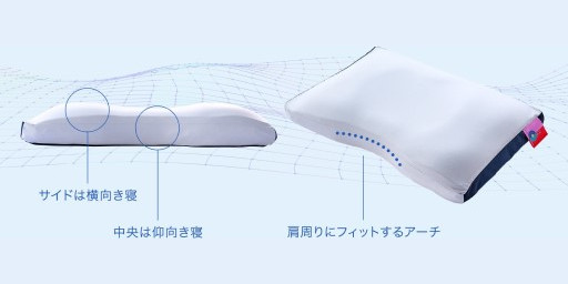 (写真中央)肩回りをアーチ状の形にすることで、首から肩までのすき間を埋めて、枕が身体に沿うことで安定した寝姿勢に導きます。