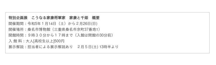 2023年大河ドラマ「どうする家康」&千姫ゆかりの三市が、桑名にて夢の競演!多彩な展覧会が開催!!