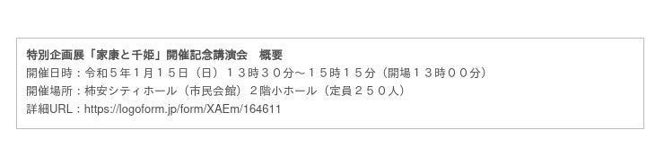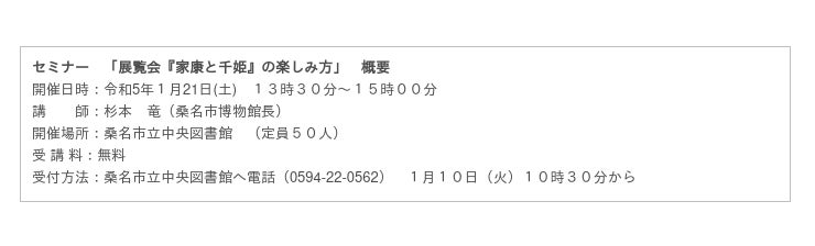 令和5年1月15日(日)柿安シティホールにて、特別企画展「家康と千姫」開催記念講演会を開催する。