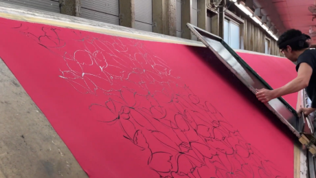 京都でも今では数人しかいないという、ハンドプリント歴45年の職人によるハンドプリント。ひと版ひと版を手作業でプリントしていく工程は一見、簡単そうに思えますが、ヘラの傾きや力の加減で線の太さが変わり、職人の匠の技術が活かされています。