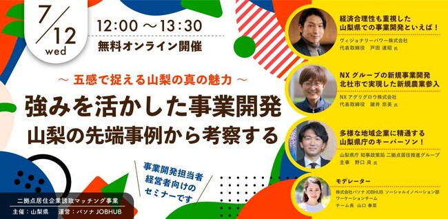 株式会社パソナJOB HUB(本社:東京都港区、代表取締役社長 高木元義)は、山梨県から受託し運営する「令和5年度二拠点居住企業誘致マッチング事業」の一環として、山梨県へのオフィス移転等を検討する企業を対象にしたオンラインセミナー『強みを活かした事業開発 山梨の先端事例から考察する』を7月12日(水)に開催いたします。