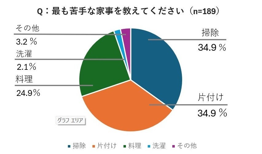 掃除:34.9%(66人) 片付け:34.9%(66人) 料理:24.9%(47人) 洗濯:2.1%(4人) その他:3.2%(6人)