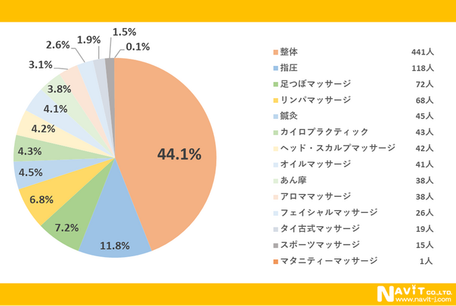 「最も利用するマッサージはなんですか?」という質問については、「整体」が44.1%、「指圧」が11.8%、「足つぼマッサージ」が7.8%と続く結果になりました。