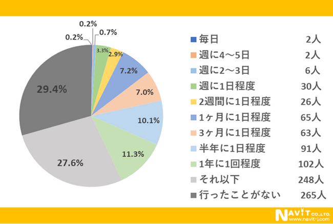 「マッサージ店にどのくらい頻度で利用していますか?」という質問については、「行ったことがない」が29.4%、「それ以下」が27.6%、「一年に一回程度」が11.3%と続く結果になり、マッサージに行かない人と滅多に行かない人が多いことが分かりました。