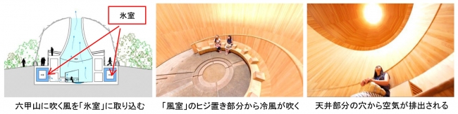 「冷風体験」は、六甲山上に吹く風を氷が貯蔵された「氷室(ひむろ)」に取り込み、展望台内部の「風室(ふうしつ)」に循環させ、涼を楽しんでいただく試みです。