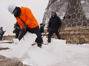 展望台東側に位置する「氷棚」では、雨水を溜めて冬の間に天然の氷を作ります。この氷をのこぎりやチェーンソーを使って切り出し、展望台内部にある「氷室(ひむろ)」に貯蔵します。夏に冷風体験をするためには、「氷棚 8面×3回の切り出し」程度の氷が必要な為、この冬、数回にわたって切り出し作業を行う予定です。