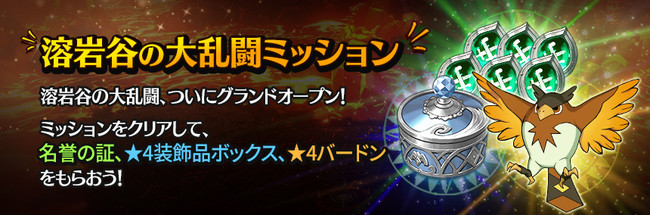 イベント期間中に「溶岩谷の大乱闘」に参加することで名誉の証や★4装飾品ボックスなどの報酬を獲得できます。また、全てのミッションをクリアすると★4イマージェン「バードン」を最終報酬として受け取れます。