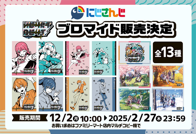 株式会社ファミリーマート(本社:東京都港区、代表取締役社長:細見研介)は、継続して取り組んでいる5つのキーワードの1つである「『あなた』のうれしい」の一環として、「にじさんじ」初となるアナログレコード/CD「HE4RT BE4T!」の同時リリースを記念し、店内マルチコピー機サービス「ファミマプリント」(以下、ファミマプリント)にて、にじさんじコラボブロマイド全13種類を2024年12月2日(月)より全国のファミリーマート約16,300店で発売いたします。