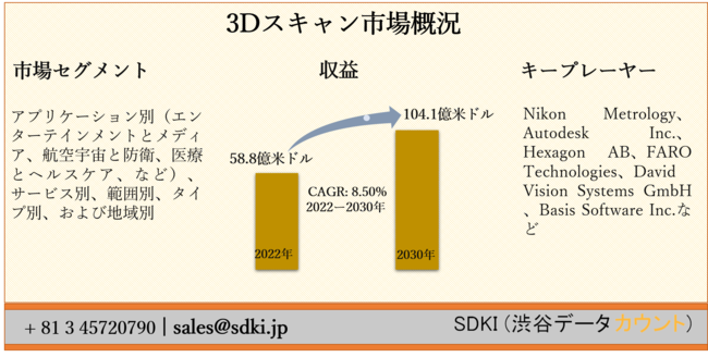 3Dスキャン市場は、2022年に58.8億米ドルの市場価値から、2030年までに104.1億米ドルに達すると推定され、2022-2030年の予測期間中に8.50%のCAGRで成長すると予想されています。