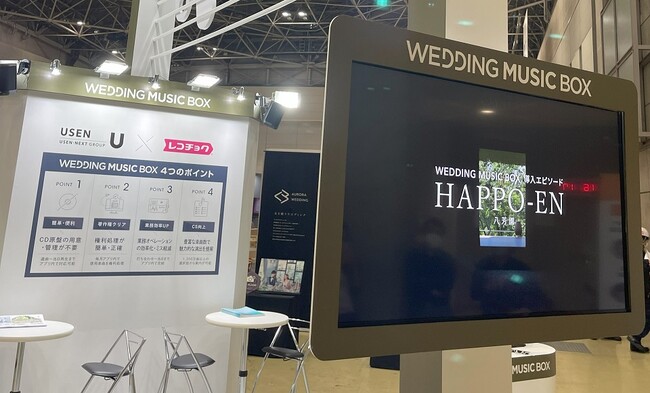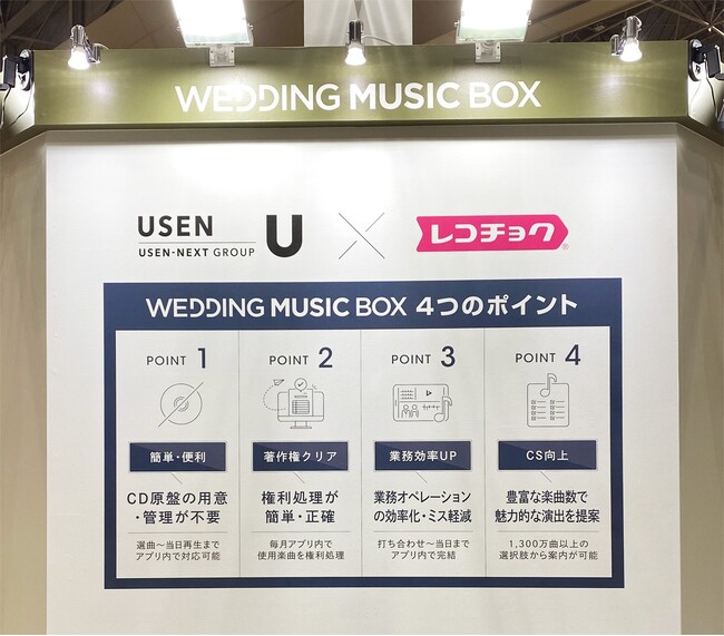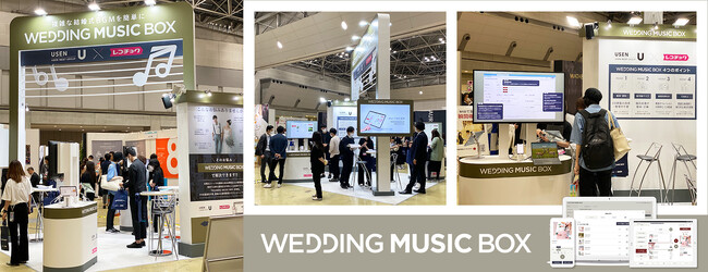 株式会社USEN-NEXT HOLDINGS(本社:東京都品川区、代表取締役社長CEO:宇野 康秀)のグループ会社である株式会社USEN(本社:東京都品川区、代表取締役社長:田村 公正、以下、USEN)と株式会社レコチョク(本社:東京都渋谷区、代表取締役社長:板橋 徹、以下、レコチョク)は、協業による披露宴BGMサービスパッケージ『WEDDING MUSIC BOX』を訴求するため、2023年5月30日(火)〜5月31日(水)に東京ビッグサイト西3ホールで開催された企業・法人向け展示会「ブライダル産業フェア 2023」に共同出展しました。展示会は、2日間で1万714名(主催者発表)が来場し、『WEDDING MUSIC BOX』のブースも多くの方にお立ち寄りいただきました。