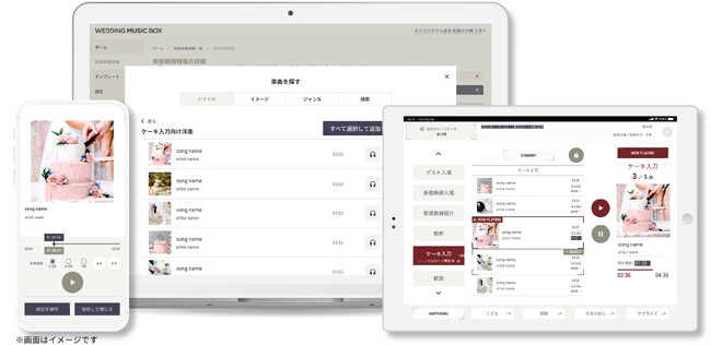 「BGMの選曲・管理」「披露宴でのBGM再生」「複雑な権利処理」など、結婚式シーンでのお困りごとをオンラインでワンストップ解決することを目指したBGMサービスパッケージです。1,300万曲以上※のJ-POP、洋楽、JAZZ、クラシック、ボサノヴァ、インストゥルメンタルまで幅広いジャンルの楽曲から、新郎新婦さまのご希望にあった楽曲を披露宴の各シーンのBGMに簡単に選曲・設定が可能です。カスタマイズでの選曲はもちろん、お好みでそのまま使用できる披露宴プログラムや、選曲に迷ったときに便利なおすすめの各種プレイリスト、結婚式場オリジナルのプログラム・テンプレート作成機能などをご用意しています。