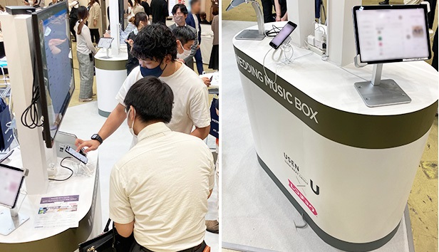 会場内ブースでは、新郎新婦さま、式場担当者さま、BGM再生担当者さま、それぞれのご利用シーンを想定したサービスの「デモ機体験スペース」を設置しました。全国各地の結婚式場の支配人さまやプランナーさまなど、日々の業務で新郎新婦さまにBGMに関するご案内をされている方々に多く立ち寄っていただきました。