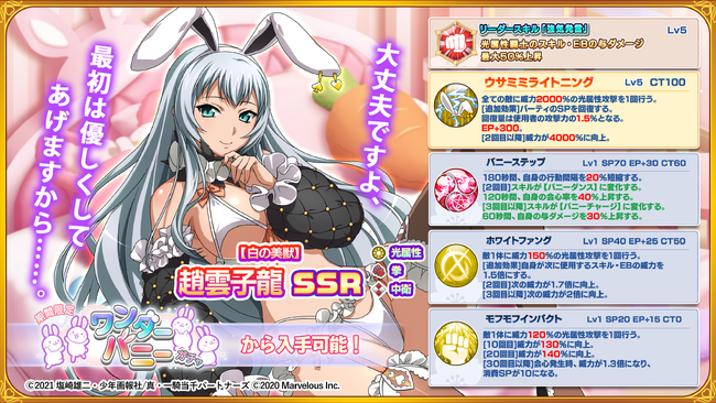 本日開始の「ワンダーバニーガチャVol.1」では、新たに「【白の美獣】趙雲子龍」(CV:浅川 悠)」が登場。