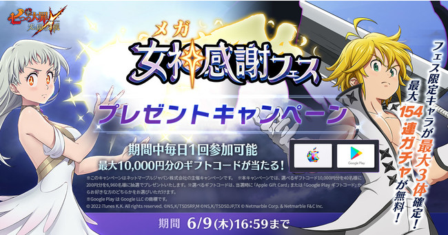 『グラクロ』3周年「女神(メガ)感謝フェス」開催を記念して、期間中合計7,000名様に最大1万円分の選べるギフトコードがその場で当たるキャンペーンを開催いたします。