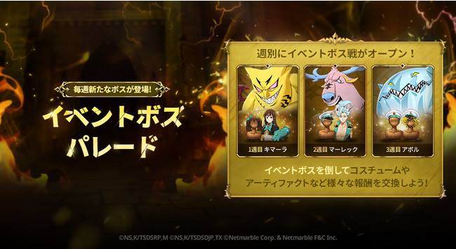鈴木央氏書き下ろしのイベントボス戦「魔神キマーラ」「魔神兵マーレック」「上級魔神アボル」を復刻開催いたします。イベントボス戦交換所では、ディアンヌ、バンの限定コスチュームや、ディアンヌ、メリオダス、キングのビューティーコスチュームに加え、ダイヤや超覚醒コイン、SSR確定ガチャチケットなどの豪華報酬を獲得できます。