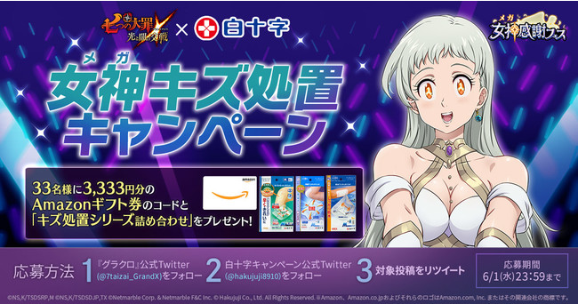 『グラクロ』公式Twitterと『白十字キャンペーン』公式Twitterを相互フォローの上、対象Tweetをリツイートしていただいた方から抽選で33名様に、3,333円分のAmazonギフト券のコードと「キズ処置シリーズ詰め合わせ」をセットにしてプレゼントいたします。