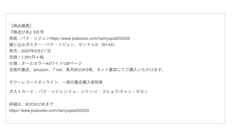 最新話題情報満載の『韓流ぴあ』9月号は、8 月21日(金)に全国書店、amazon、タワーレコードオンライン、7netショッピング、HMV、RakutenブックスなどECサイトほか、韓流ぴあSHOP(LINE)で発売。なお、一部の書店、ECサイトでの予約購入者には、特製ポストカード(パク・ソジュン、イム・シワン、チャン・ギヨン、イ・スヒョク)をもれなくプレゼントするほか、タワーレコードではサンドゥル(B1A4)、7netではチョン・イル、韓流ぴあSHOPではパク・ソジュンAと、それぞれ2L判生写真付版本誌もご用意。また、パク・ソジュンファンクラブでも特典付きで発売。毎号話題満載でお届けする『韓流ぴあ』にどうぞご期待ください!