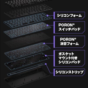 PORON(R)とシリコンの5層構造で打鍵音と振動を吸収。静かで快適な打ち心地を実現。