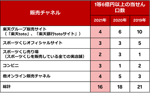 (注1)「BIG」の1等当せん金は最高3億円で、キャリーオーバー発生時には最高6億円となります。当せん金は、売上金額や当せん口数によって変動します。本発表は、スポーツくじオフィシャルサイトの情報に基づき、特別開催回を含む6億円以上となった1等当せん口数を楽天が集計したもので比較しています。なお、2021年の当せん口数は第1215回(販売期間2020年12月26日〜2021年1月2日)から第1274回(販売期間12月25日〜12月28日)までが対象です。