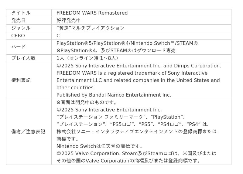 ■ 「FREEDOM WARS Remastered 公式」 Xアカウント:https://x.com/FWRe_Official