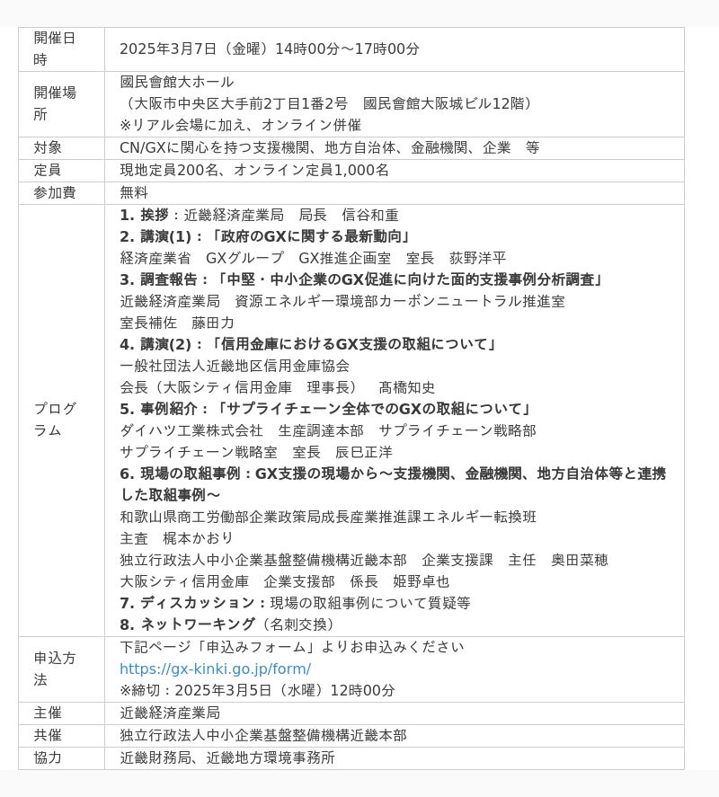 中小機構(独立行政法人中小企業基盤整備機構)近畿本部は、近畿経済産業局と共催で「中堅・中小企業のGX推進を支える面的支援シンポジウム」を3月7日(金曜)に開催します。