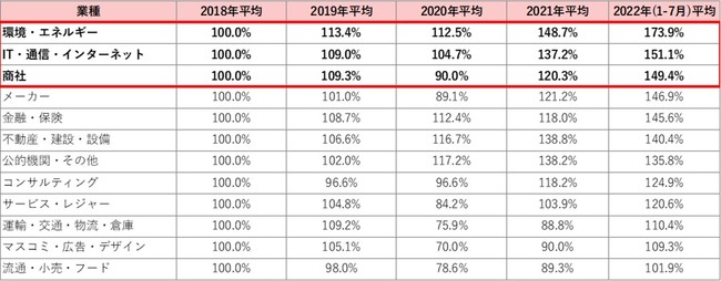 2022年1-7月で最も求人広告の掲載数が伸びている業種は「環境・エネルギー」で173.9%、次いで「IT・通信・インターネット」で151.1%、「商社」で149.4%と続いた。新型コロナウイルスの影響で2018年平均を下回っていた「流通・小売・フード」「運輸・交通・物流・倉庫」などの業種についても、2022年1-7月平均ではすべて100%以上となった。【図6】
