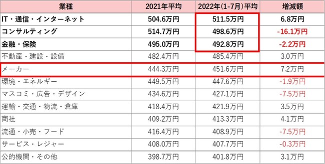 2022年1-7月の平均初年度年収は453.9万円で上昇率は鈍化。2021年平均と比較して最も年収が増加した業種は「メーカー」、次いで「IT・通信・インターネット」【図1、2-1、2-2、3】