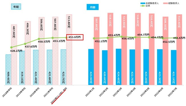 2022年1-7月の正社員の平均初年度年収は453.9万円(未経験者求人:422.7万円、経験者求人:513.8万円)。調査を開始した2018年からの年間平均と比較すると年収は増加傾向にあるが、上昇率は鈍化した。【図1】