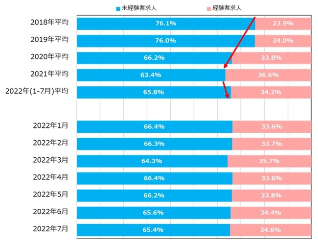 2022年1-7月の求人件数は調査を開始した2018年の年間平均比134.1%という結果だった。月別でみると特に6月・7月は140%以上で推移しており、企業の採用意欲の高まりが顕著に見られた。また、掲載求人の平均募集比率は、未経験者求人が65.8%、経験者求人が34.2%だった。2021年までは年間平均の経験者求人比率が増加傾向にあったが、今年に入り減少に転じた。【図4、5】