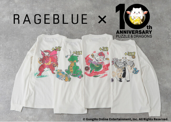 「Play fashion!」をミッションに掲げ、”グッドコミュニティ共創カンパニー”を目指す株式会社アダストリア(本部:東京都渋谷区渋谷2-21-1、代表取締役社長:木村 治)が展開するRAGEBLUE(レイジブルー)は、ガンホーのスマートフォン向けパズルRPG『パズル&ドラゴンズ』の10周年を記念したプロジェクト「+297プロジェクト」とのコラボアイテムを、8月31日(水)より公式WEBストア .st(ドットエスティ)、ZOZOTOWNにて順次予約販売を開始いたします。