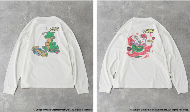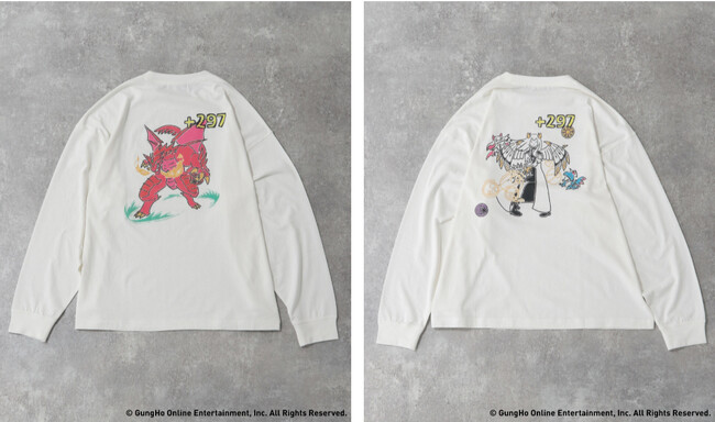 レイジブルーとのコラボレーションでは、長袖Tシャツに、人気イラストレーターam./アムさんによるかわいらしい描きおろしイラストをプリントした、全4種類のアイテムをラインアップ。フロントの左胸には、ポップにデザインされた「PUZZLE&DRAGONS」の文字があり、「ボルケーノドラゴン」、「ガチャドラ」、「エキドナ」、「イデアル」をモチーフにしたイラストが、それぞれバックにプリントされています。